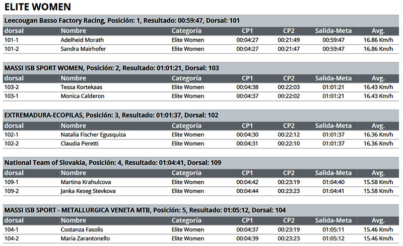 Las vencedoras han sido la alemana Adelheid Morath y la italiana Sandra Mairhofer (LeeCougan Basso) con un tiempo de 59’47”, seguidas por la holandesa Tessa Kortekaas y la colombiana Mónica Calderón (Massi) (1:01’21”), segundas, y por Fischer y Peretti, terceras (1:01’37”). A más de 3 minutos irían llegando el resto de corredoras, la pareja eslovaca Krahulcova-Stepkova (1:04’40”), cuartas, o las italianas Fassolis-Zarantonello, quintas (1:05’12”), todas ellas entre las treinta primeras corredoras de la clasificación mundial UCI, donde Natalia Fischer ha ascendido hasta la tercera posición, tras ese impresionante arranque de temporada.