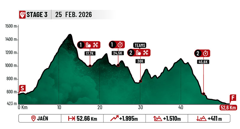 Mañana empieza lo realmente duro que es donde mejor “esperan desenvolverse la pareja hispano-italiana pero siendo conscientes de que el día a día será muy duro y al tratarse de competición por pareja, la conexión entre ambas debe funcionar a la perfección” algo que parece tienen bien asimilado Natalia y Claudia, junto a sus respectivos equipos técnicos. La etapa de mañana, 52,66 Kms +1996 mts, transcurre íntegramente por Jaén, donde la subida inicial larga por Jabalcuz hasta su punto más alto, con pista rota y rampas exigentes, seguida de una bajada técnica antes de recorrer la parte central de senderos estrechos, subidas cortas y explosivas, pasos de roca y bajadas rápidas entre olivares, antes de afrontar la gran subida del día, casi 600 metros de desnivel que seguro habrá despejado la incógnita de quiénes pueden alzarse con el triunfo de etapa.