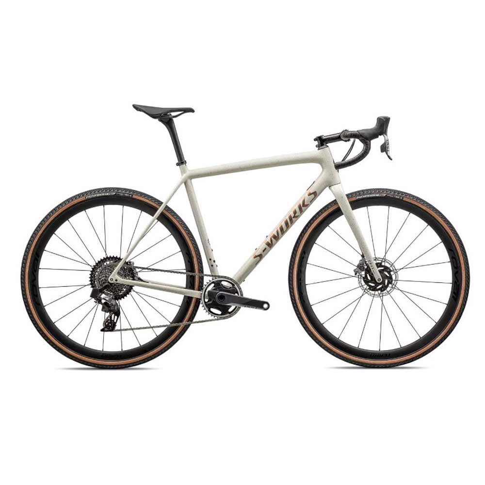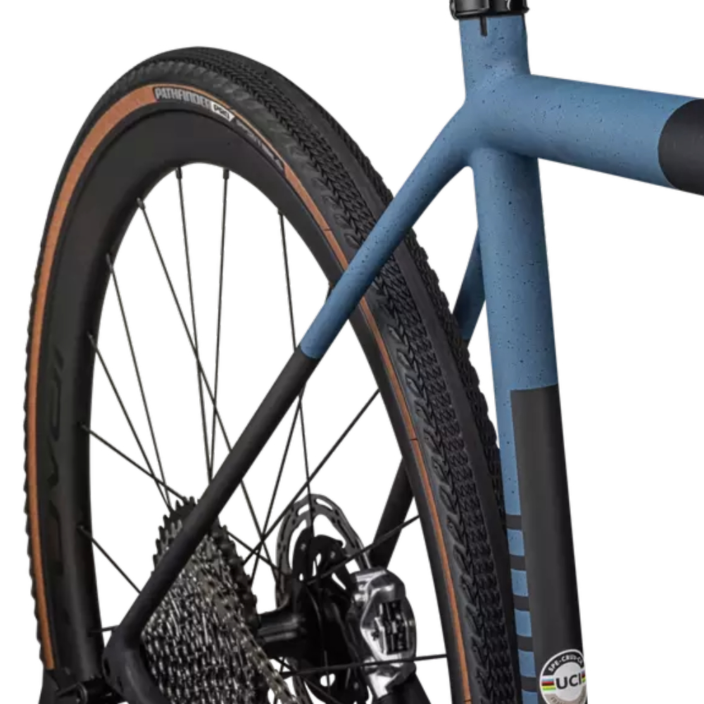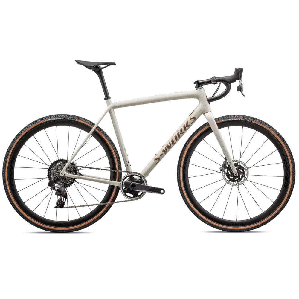 Este S-Works Crux viene equipado con el grupo de discos hidráulicos RED eTap AXS de SRAM, ruedas Roval Terra CLX Disc ligeras y duraderas y neumáticos Pathfinder Pro de 700 x 38 mm 2Bliss Ready que se enganchan en terrenos difíciles.